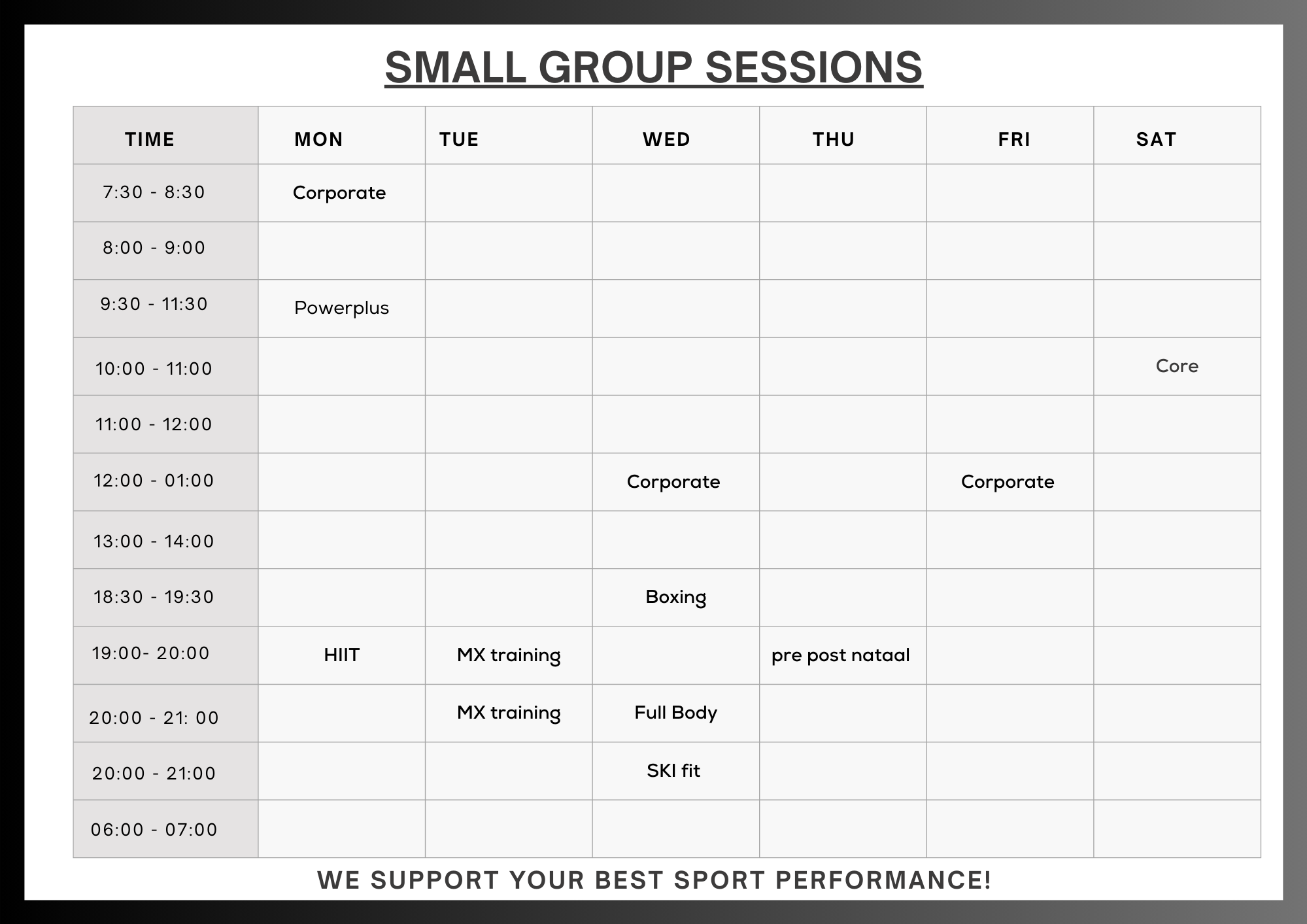 All our group classes are small group training sessions. This means that there are a maximum of 8 people in a group to ensure the quality and follow-up of the lesson is optimal